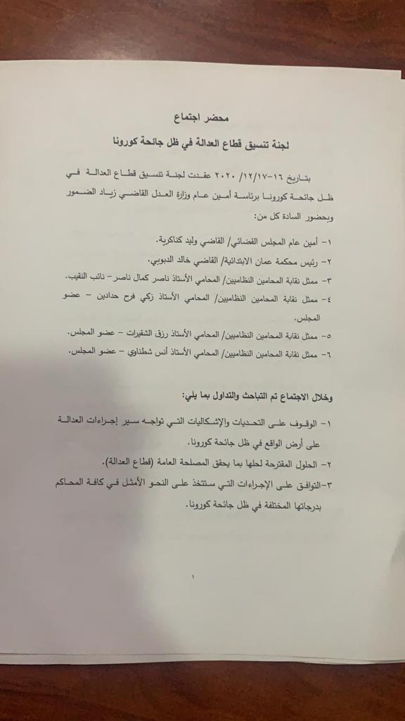 وحضر الاجتماع لجنة تنسيق قطاع العدالة في ظل جائحة كورونا برئاسة أمين عام وزارة العدل القاضي زياد الضمور وبحضور أمين عام المجلس القضائي القاضي وليد كناكريه، ورئيس محكمة عمان الابتدائية القاضي خالد الدبوبي وممثل نقابة المحامين النظاميين المحامي ناصر كمال الناصر نائب النقيب وممثل نقابة المحامين النظاميين المحامي زكي حدادين وممثل نقابة المحامين النظاميين المحامي رزقي شقيرات.