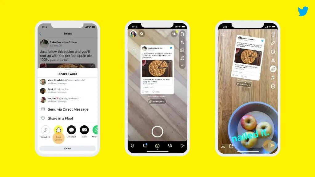 فيما سبق؛ كانت الطريقة الوحيدة لمشاركة التغريدات مع تطبيق سناب شات هي حفظ لقطة للشاشة في تطبيق تويتر، ثم تحميلها على تطبيق سناب شات، لنشرها كمنشور جديد، ولكن الآن يمكنك نشر أي تغريدة في تويتر عبر سناب شات من خلال الضغط على زر المشاركة في تغريدة.
