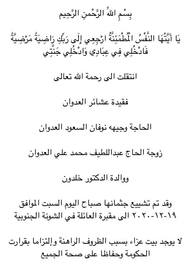 الحاجة وجيهة نوفان السعود العدوان في ذمة الله19-12-2020 12:03 PM