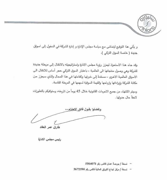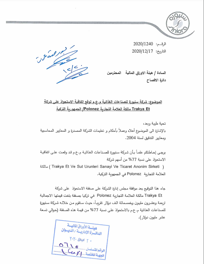 عمون - وقعت شركة سنيورة للصناعات الغذائية م.ع.م اتفاقية للاستحواذ على 77% من اسهم شركة Trakya ET، مالكة العلامة التجارية Polonez في الجمهورية التركية. |