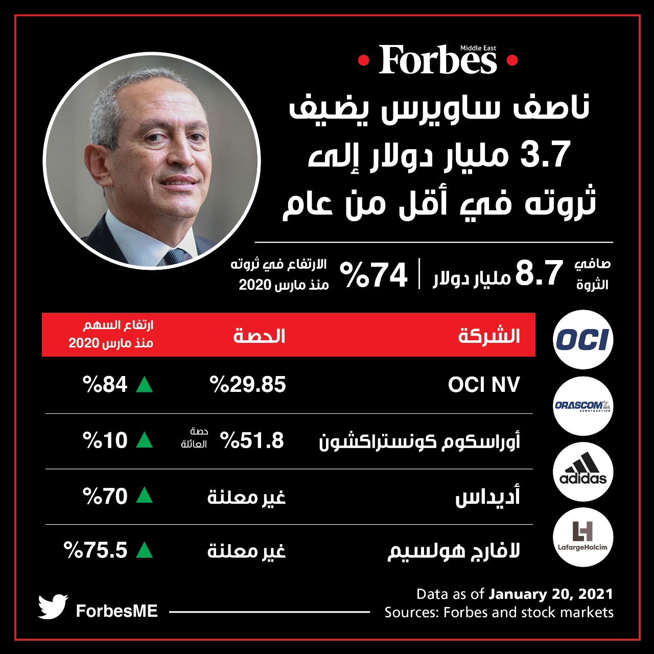 جاءت الزيادة الكبيرة في ثروة قطب الأعمال المصري بدعم من ارتفاع سهم OCI NV في بورصة أمستردام بنحو 84% منذ إعداد فوربس لقائمة المليارديرات في 18 مارس/آذار 2020. وبلغ سعر السهم بحسب إغلاق أمس الأربعاء نحو 21.9 دولارا، مقابل 11.9 دولارا وقت إعداد القائمة. ولدى ناصف ساويرس حصة 29.85% في الشركة، في حين تبلغ حصة والده أنسي ساويرس 17.14%، وشقيقه سميح ساويرس 11.4%، بحسب بيانات الشركة على بورصة يورونكست.