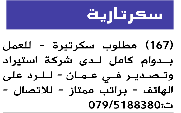 مطلوب سكرتيرة للعمل لدى شركة استيراد وتصدير
