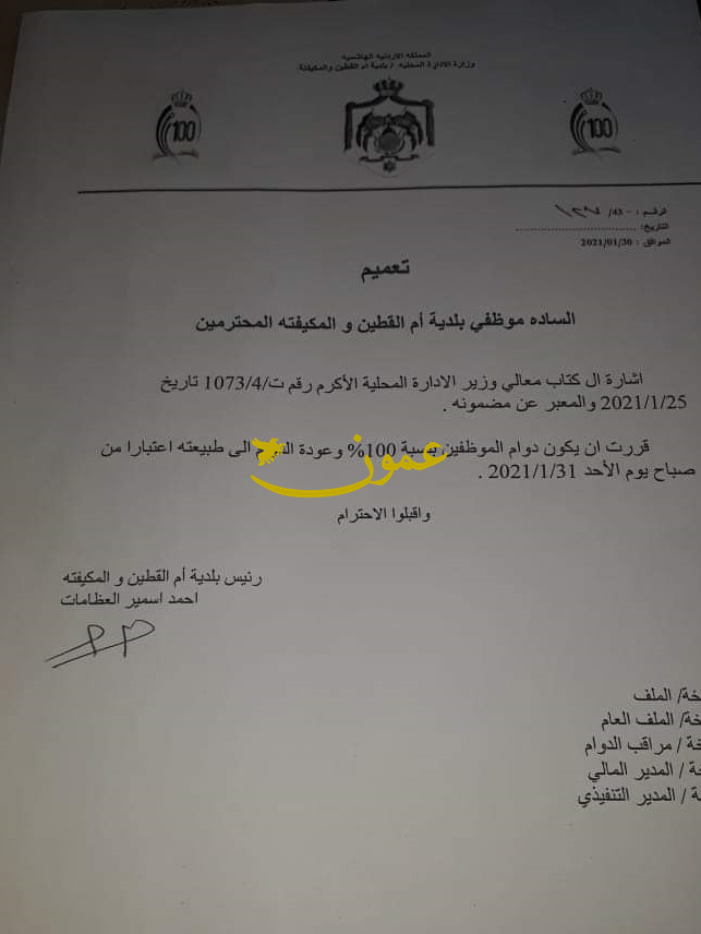 عمون - قررت عدة بلديات عودة موظفيها إلى العمل بنسبة 100% بناء على كتاب صادر عن نائب رئيس الوزراء وزير الادراة المحلية توفيق كريشان. |