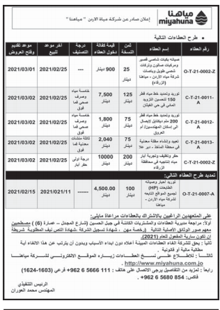 عطاءات صادرة عن شركة مياه الاردن (مياهنا)