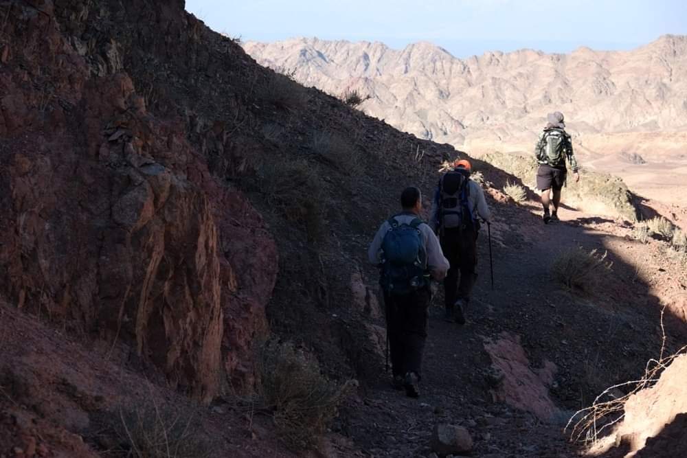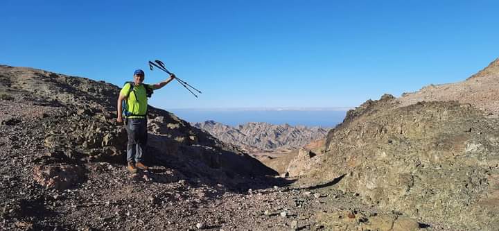 ومن ارتفاعٍ لامس الألف متر، عدنا للنزول بعد مسير شائق على سيف الجبل لنسلك درب قديم قد شقّ بين الصخور لبطن الوادي، لنأخذ استراحتنا الثانية ونعود مرة أخرى للصعود في السلسلة الأخيرة المحاذية للخليج عبر سيق صاعد، حيث وصلنا لقمة لا تقل روعة عن سابقها، والاستراحة لم نتركها إلا بفنجان قهوة يرافقه التأمل تارةً ونظرة إلى البحر تارة أخرى وإلى ما خلفنا من سلاسل جبلية، وإلى الأفق البعيد حيث جبال رم وهي نقطة البداية لدينا.