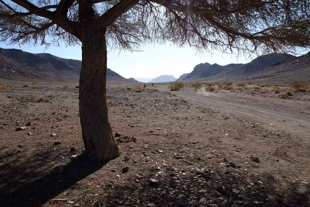 حملنا احتياجاتنا من الماء "أربعة ليترات" وعصير وزوادة خفيفة، سالكين الدرب ما بين الغرب والجنوب نحو قرية تيتن المحاذية للحدود الشقيقة السعودية، بين سلسلة من الجبال تتغير أشكالها من اتجاه إلى آخر، لنخرج من الكثبان الذهبية إلى طريق رملي بازلتي وصخري تارة تلو الأخرى، مروراً بعدد من الآبار ومشارب الماشية والإبل، ومن بعدهم سدين تجميع لمياه السيول والتي أقامتهم سلطة إقليم العقبة في الوادي، محددين نقطة الاستراحة الأولى بعد اجتياز سبعة كيلومتر عند الشجرة الوحيدة التي صادفتنا بتلك المسافة، وإقامة صلاة الظهر بجامع الرعيان وهو صف من الحجارة الفردية دون بناء وله محراب نحو القبلة.