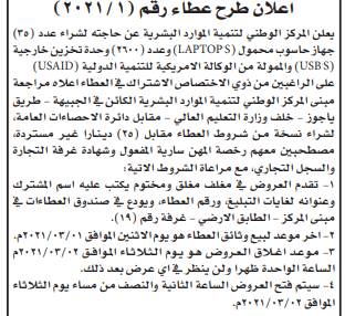 المركز الوطني لتنمية الموارد البشرية بحاجة لشراء اجهزة حاسوب محمولة