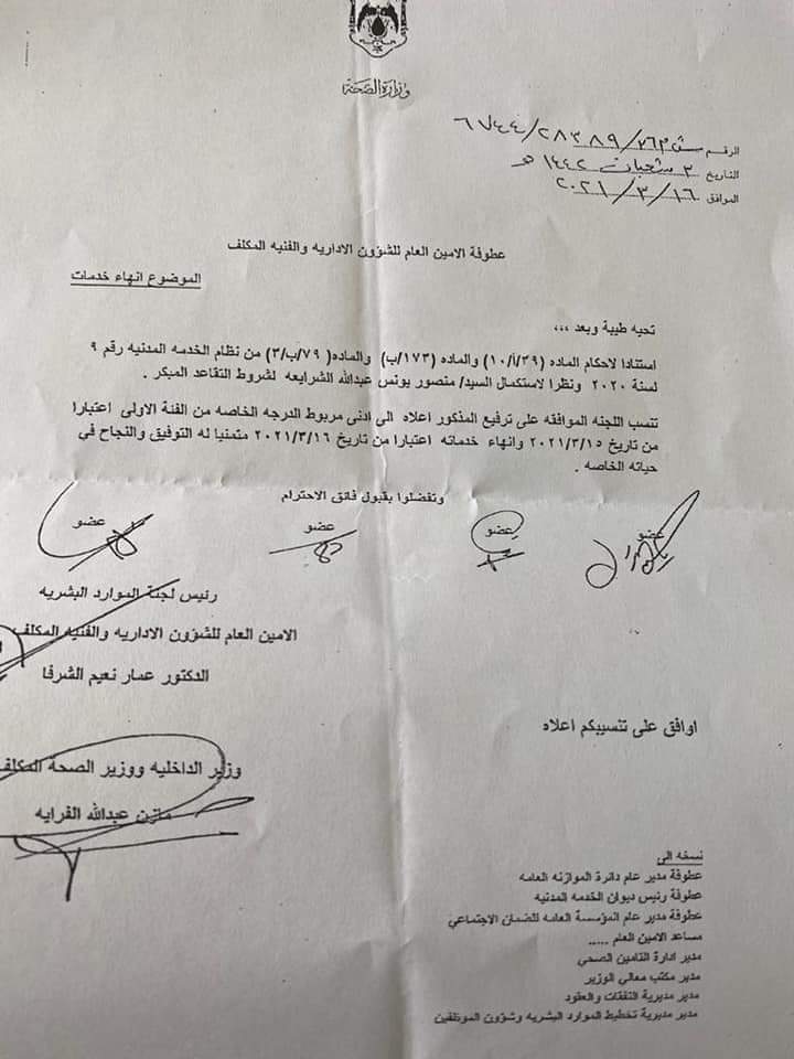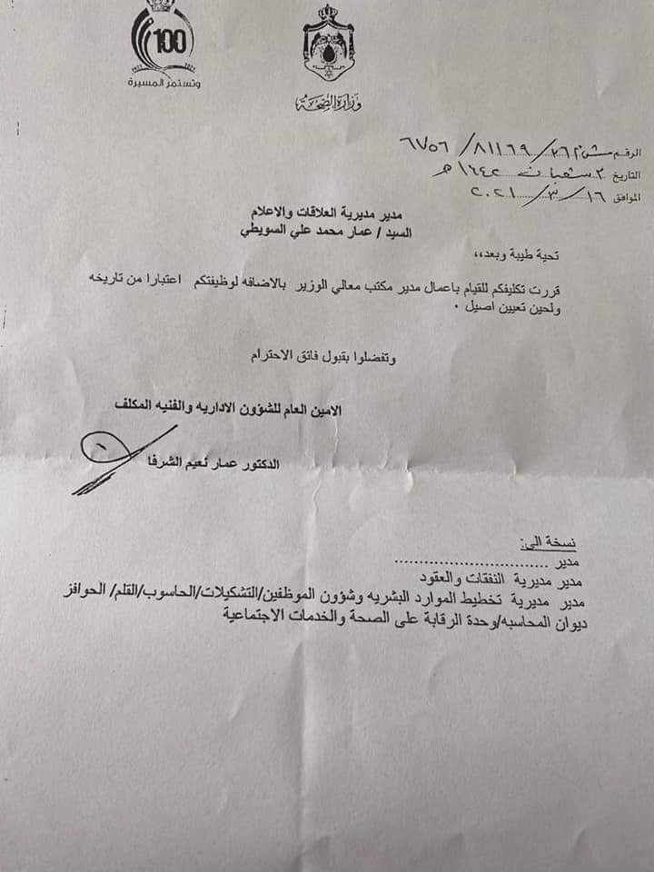 انهاء خدمات مدير مكتب وزير الصحة وتكليف السويطي16-03-2021 12:36 PM
