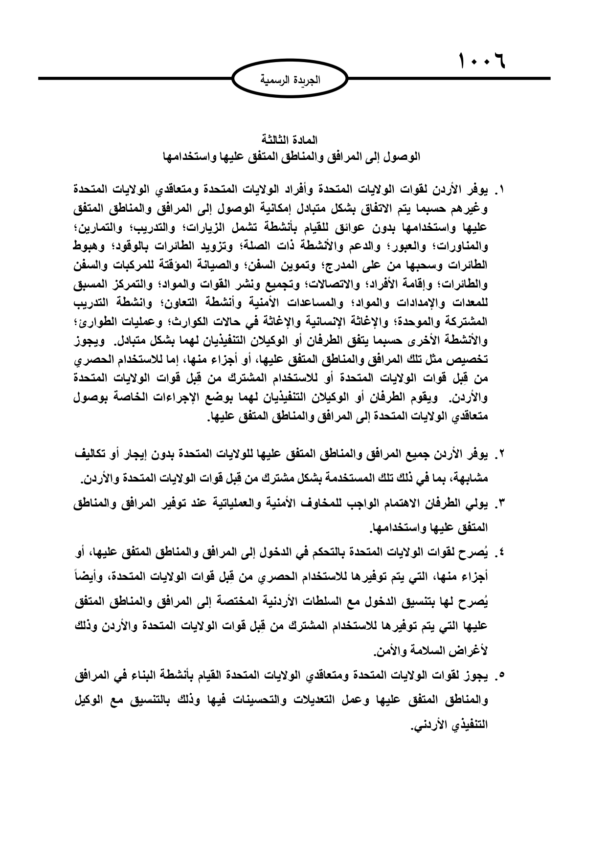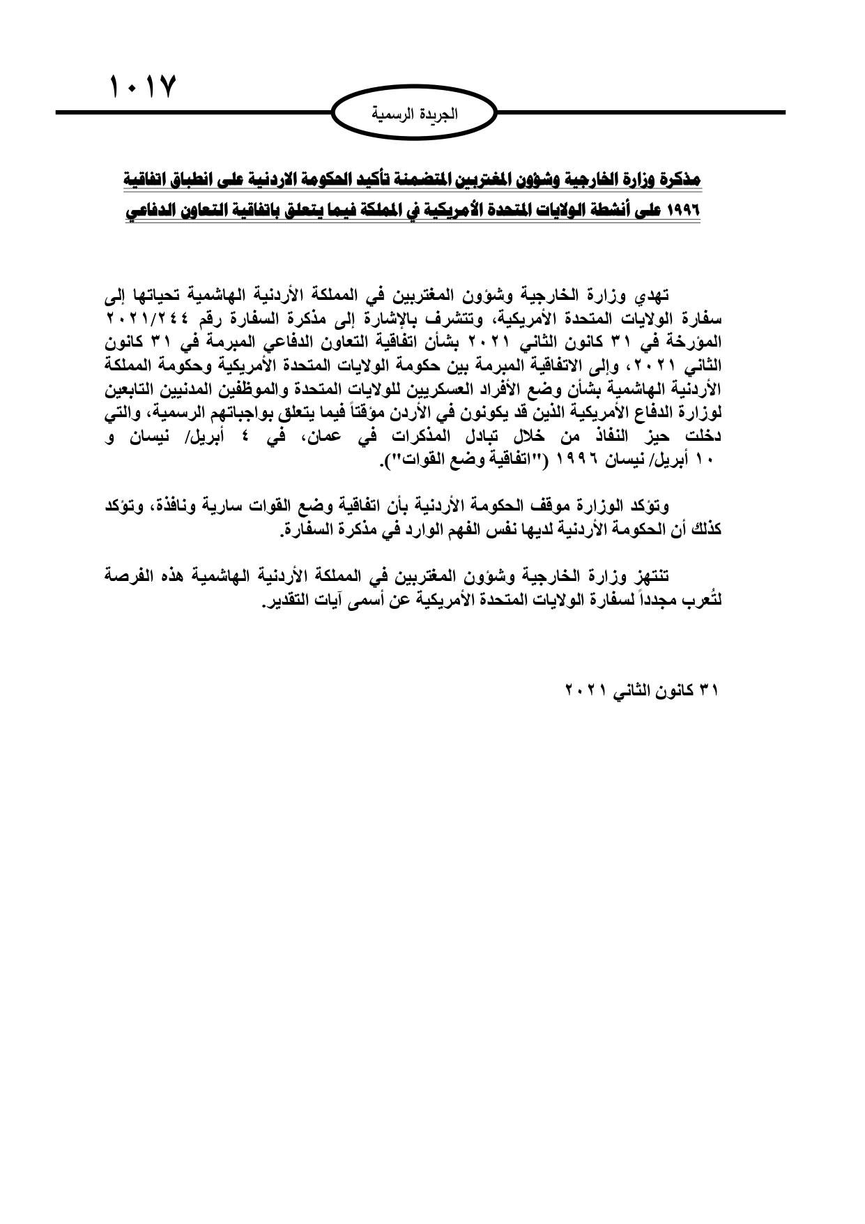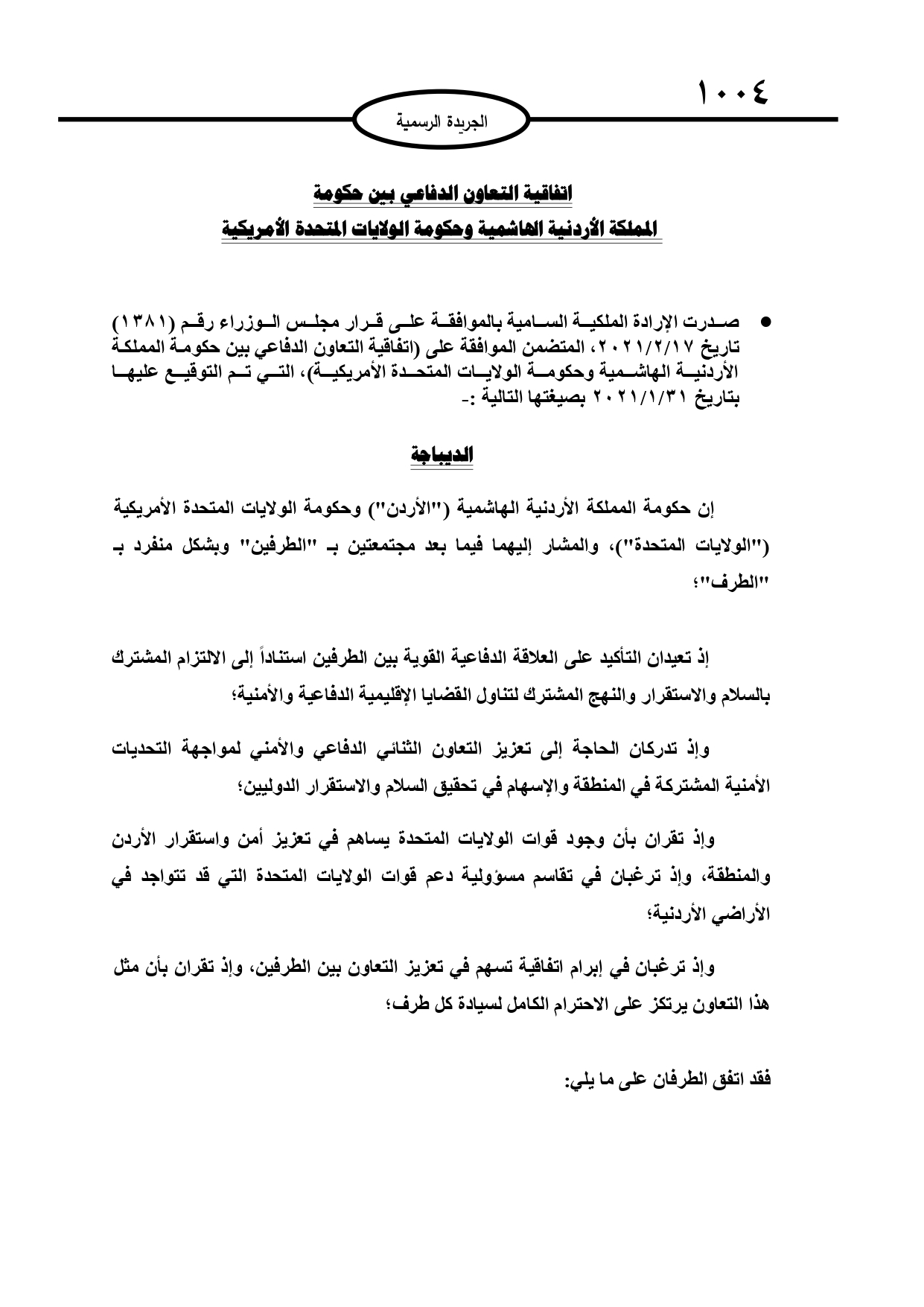 عمون - صدر في عدد الجريدة الرسمية الثلاثاء، اتفاقية تعاون دفاعي بين حكومة المملكة الأردنية الهاشمية وحكومة الولايات المتحدة الأمريكية. |