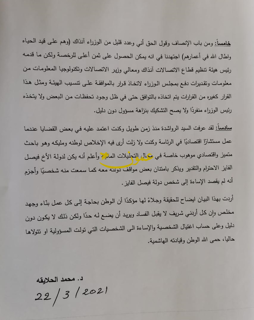 وقال الحلايقة في بيان له ردا على مقطع فيديو اقتطع من حديث للمستشار الاقتصادي محمد الرواشدة حول منح الرخصة وسعر بيعها في ذلك الوقت، إن القرار لم يكن لرئيس الوزراء منفردا بل جاء بناء على دراسات وتقييم اجرته الهيئة لتحديد حاجة السوق وفتح باب المنافسة.