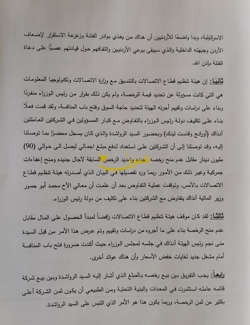 وبين أن هيئة تنظيم قطاع الاتصالات كانت رافضة لمبدأ الحصول على المال مقابل عدم منح الرخصة بناء على تقييم اجرته، وعرضت الأمر رئيسة الهيئة آنذاك منى نجم في جلسة لمجلس الوزراء أكدت فيها ضرورة فتح باب المنافسة امام مشغل جديد لغايات خفض الاسعار، مشيرة الى وجود عوائد اخرى.