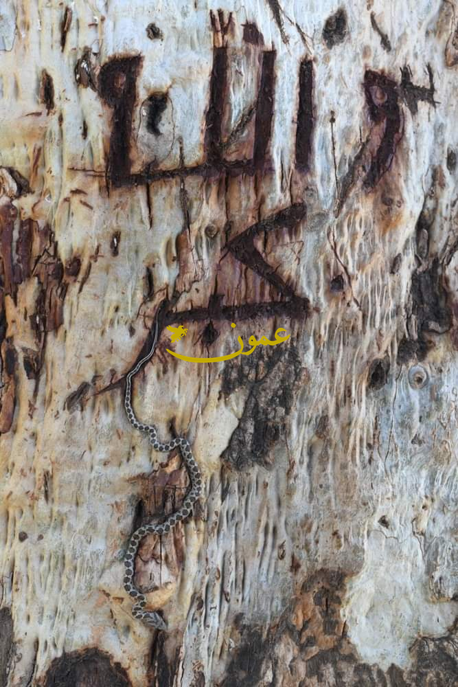 شدنا ضخامة الكينا "الكافور" الذي قد جاء به الجند الأستراليون أبان الحرب العالمية الأولى عام 1916، عندما ناصروا حليفتهم بريطانيا أبان انتداب الوطن بزراعته حول معسكراتهم لسرعة نموه وطرده للحشرات المؤرقة لصفوة الليل من هسهس وناموس وذباب ولكثافته لتموية قواعدهم، واستغل المزارعين اخشابه حتى يتم صناعة صناديق منتجاتهم لغاية حل مكانة الفلين الأبيض والكرتون المقوى، اخترنا استراحتنا بين هذه السلسلة من الأشجار ونحن نقرأ سجل ما كتب عليها المارون من تذكار؛ فمحمود قلبه تعلق بليلى دون أن يصرح باسم عائلتها، وخالد دوّن تاريخ زيارته ورأينا "الله اكبر". وهنا كانت المفاجئة، فقد رأينا فرخ افعى قد خرج من بين الشقوق مع أنه ليس بالخطير، ولكن هذا مؤشر لوجود غيره، فهذا موسم خروجهم من الجحور جائعين مع ارتفاع درجات الحرارة بما يعرف بالمواقيت الزراعية العربية "بسعد الخبايا".