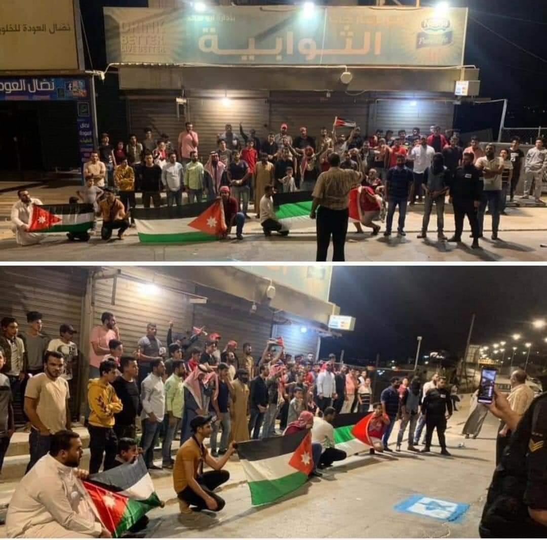 عمون - رد ابناء منطقة العدسية في لواء ناعور، على الاعلامي العبري، ايدي كوهين، بتجمعهم أمام "سوبر ماركت الثوابية" رافعين أعلام الأردن وفلسطين. |