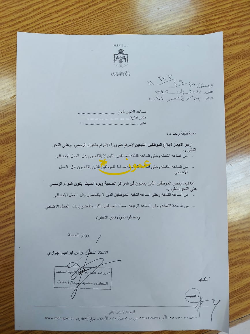 واصدر امين عام وزارة الصحة الدكتور محمود زريقات تعميما حدد ساعات الدوام الرسمي من الساعة الثامنة صباحا وحتى الثالثة مساء للموظفين الذين لا يتقاضون بدل عمل اضافي وللساعة الخامسة للذين يتقاضون العمل الاضافي.