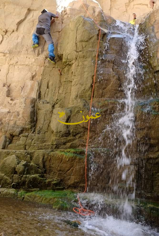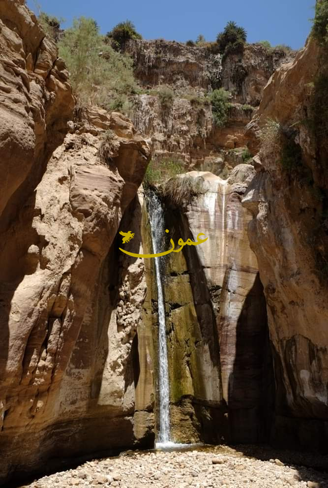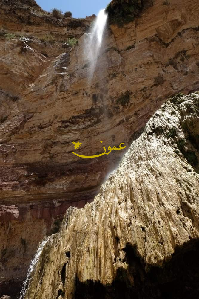 مشهد مهيب بحضن مسقطه القوسي المفتوح نحو البحر المقابل لجبال فلسطين، أسفله ألوان الطيف المتكونة بفعل الرذاذ المتطاير من شدة الانهمار ومتعة الجلوس تحت مائه المتساقط بقوة مع الهوابط الصخرية والملحية التي تكونت عبر عشرات السنين وجفت جراء تغير مجراه، ونباتات كان سيدها النخيل الحاضر بين الشقوق كالجنان المعلقة، كانت استراحتنا التي لم تخلُ من إبريق شاي وعصائر كالعادة، تحت سلسلة ضخمة من الهوابط الخضراء الموشحة بالسرخسيات كالمظلة من المسقط الحالي، لينتهي مساره الأوسط عند هذه النقطة والعودة نحو الصخرة الوحيدة وما حولها من جلاميد كلسية وملحية مجوفة بتشكيلات مشابهة لما يعرض من تضاريس سطح الكواكب والقمر غير البعيدة عن الطريق الرئيسي سوى بضعة أمتار من صعود القاطع الصخري للطريق، أما خيار الصعود لقمة الشلال عبر الركام المتساقط من محيطه فهو خيار صعب جدا وخطأ واحد قد يكلفك حياتك لارتفاعه الشاهق وصعوبة العودة إنْ وقعت بفخ الطريق لهشاشة الدوس على الصخور الملحية وعدم تماسكها إلا اذا كنت صاحب خبرة وقدرة كبيرة، غير ذلك فلا تجازف وإنْ كان فيجب ضمن فريق مختص وقائد حكيم.