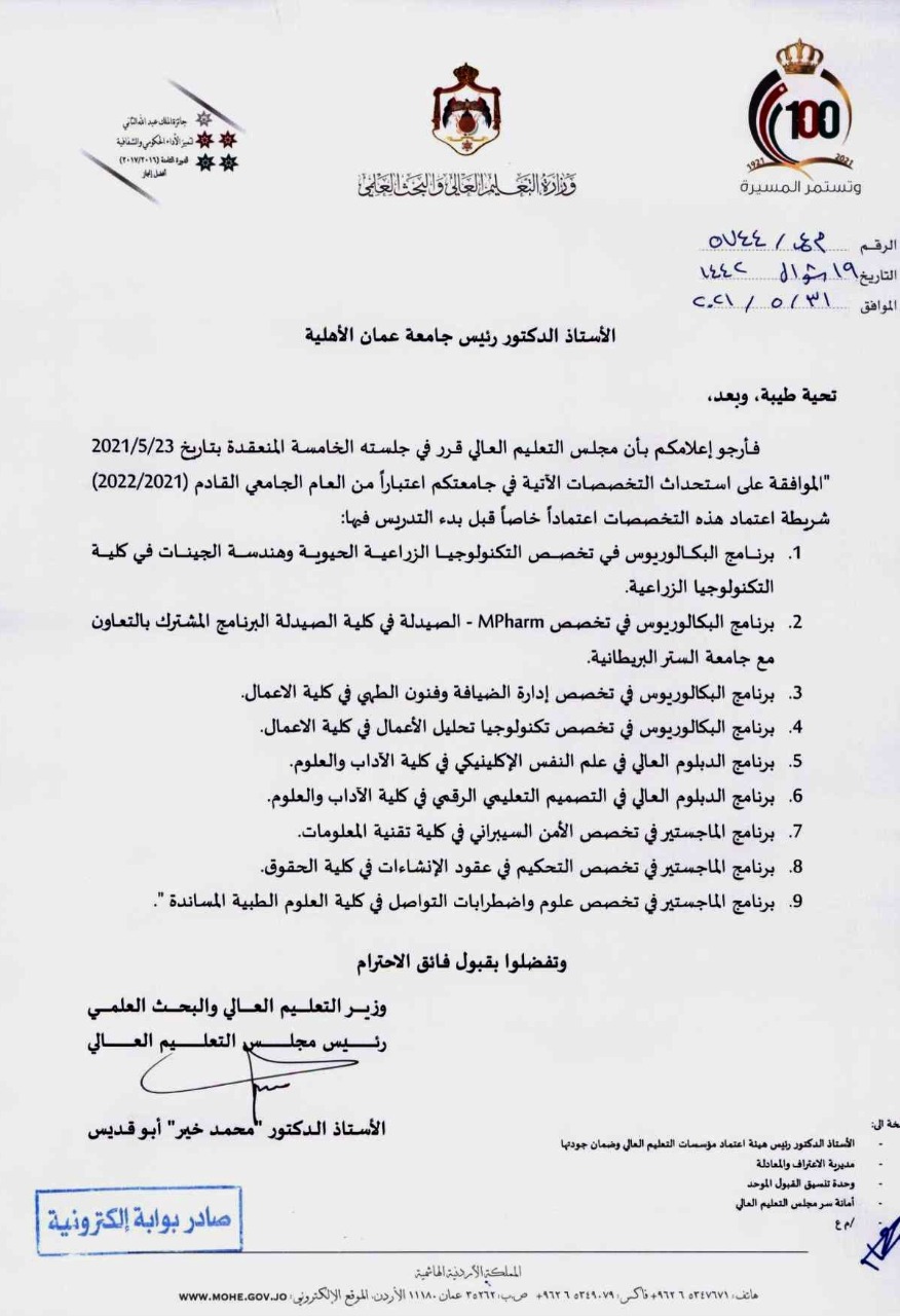 عمون - مواكبة للتطورالعلمي والتكنولوجي ومواءمة بين البرامج الاكاديمية ومتطلبات سوق العمل ، وضمن الرؤية الاستراتيجية الثاقبة لجامعة عمان الأهلية ، وبجهود إدارتها ممثلة برئيس هيئة المديرين الدكتور ماهر الحوراني ورئيس الجامعة الاستاذ الدكتور ساري حمدان وعمداء الكليات ودائرة الإعتماد وأعضاء الهيئة التدريسية في مختلف التخصصات ... حصلت الجامعة على موافقة مجلس التعليم العالي على استحداث تسعة تخصصات نوعية لدرجات البكالوريوس والدبلوم العالي والماجستير ، حيث وافق مجلس التعليم العالي في جلسته الخامسة المنعقدة بتاريخ 23-5-2021 على استحداث هذه التخصصات اعتبارا من العام الجامعي 2021-2022 شريطة اعتماد هذه التخصصات اعتمادا خاصا قبل بدء التدريس فيها والتخصصات هي :