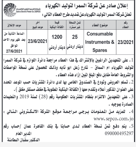 عطاء صادر عن شركة السمرا لتوليد الكهرباء