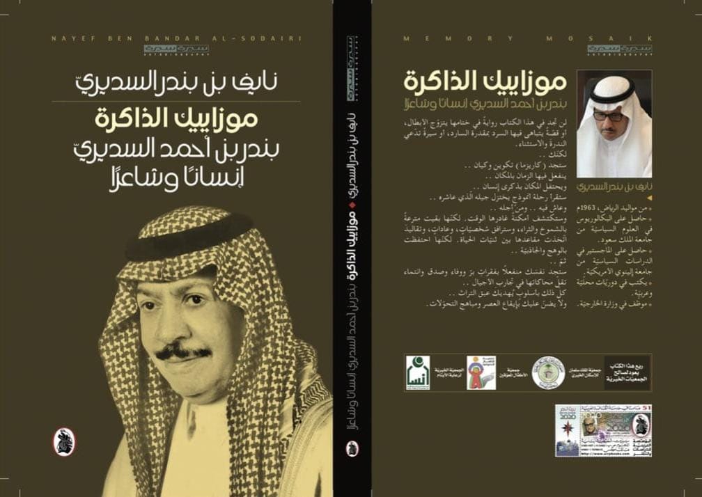 عمون - من بسام العريان - صدر عن المؤسسة العربية للدراسات والنشر كتاب مذكرات سيرة جديد بقلم نايف بن بندر السديري ويحمل عنوان «نايف بن بندر السديري موزاييك الذاكرة بندر بن أحمد السديري إنساناً وشاعراً.
