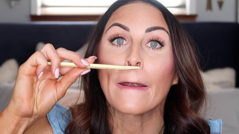 5. استخدمي يد لشد البشرة واليد الأخرى لحمل الشفرة بزاوية 45 درجة ثم حركيها بسلاسة لأسفل، وكوني لطيفة ودقيقة.