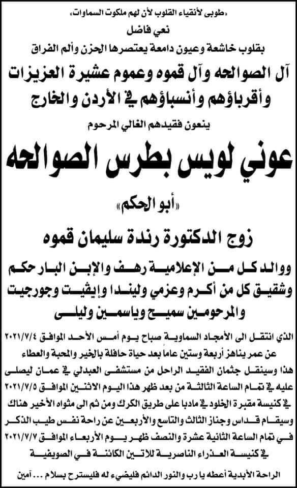 عمون - بقلوب خاشعة وعيون دامعة يعتصرها الحزن وألم الفراق، ينعى آل الصوالحة وآل قموة وعموم عشيرة العزيزات وأقرباؤهم وأنسباؤهم في الأردن والخارج فقيدهم عوني لويس بطرس الصوالحة (أبو الحكم)، والذي انتقل إلى الأمجاد السماوية صباح الاحد عن عمر يناهز 64 عاماً بعد حياة حافلة بالخير والمحبة والعطاء.