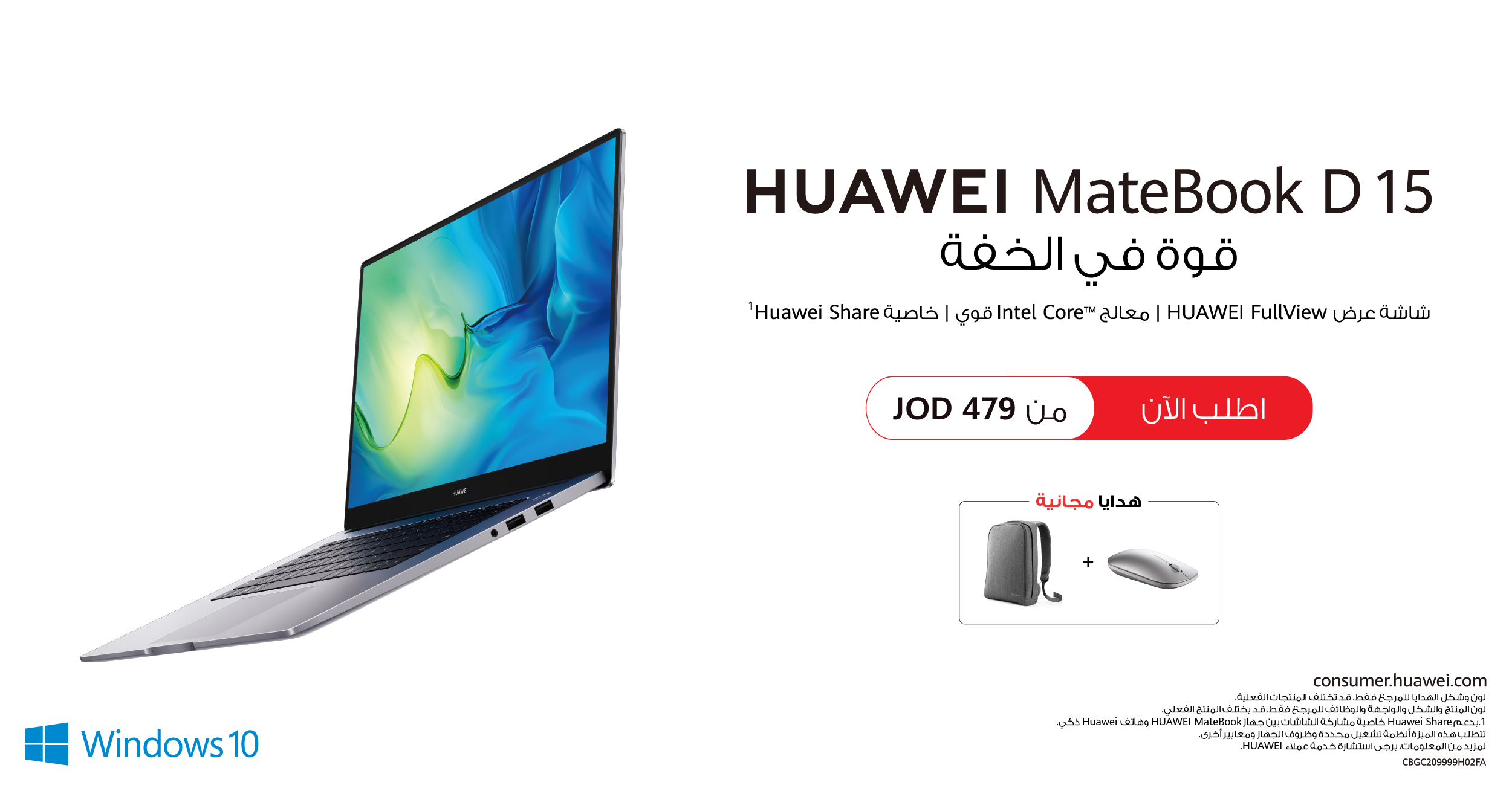 ابتداءً من اليوم 8 آب، وحتى الأحد القادم 15 آب الجاري، سيكون الحاسوب المحمول HUAWEI MateBook D15 متاحًا للطلب المسبق في الأردن باللون الرمادي الفضائي، وبسعر يبدأ من 479 دينارًا، مع هدية مجانية عبارة عن ماوس وحقيبة ظهر. لا تتردد في حجز نسختك من خلال متجر هواوي شروق الأردن الإلكتروني، عبر الرابط التالي: https://huaweieshop.jo/ar/laptops/matebook-d15-i3-10th، أو من خلال متجر هواوي Cell Avenue الإلكتروني عبر هذا الرابط: https://www.cellavenuestore.com/product/huawei-matebook-d15-i3-10th/.