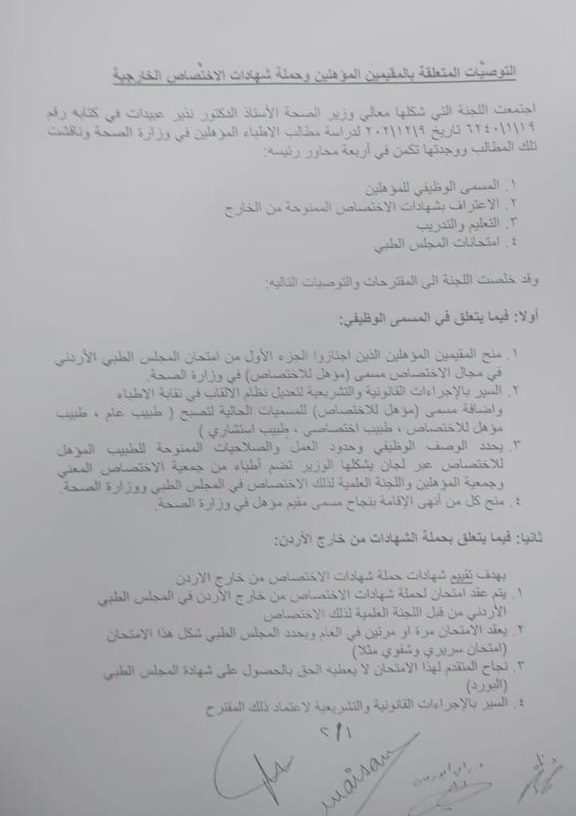 الأطباء طالبوا حل ملفهم وإنهائه لا سيما أن اللجنة التي شكلها وزير الصحة الأسبق د.نذير عبيدات قد أنصفت هذه الفئة ووضعت حلولا ومقترحات لحل عدة أمور شائكة منها المسمى الوظيفي للأطباء المؤهلين والذي وافق وزير الصحة الدكتور د.فراس الهواري على مقترح تلك اللجنة بهذا الخصوص ولكن فيما يخص موضوع معادلة البوردات الأجنبية للتخصصات الرئيسية ما يزال عالقا دون أدنى حل أو بوادر تفضي لإنهائه.