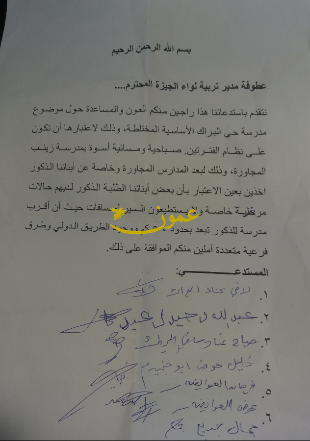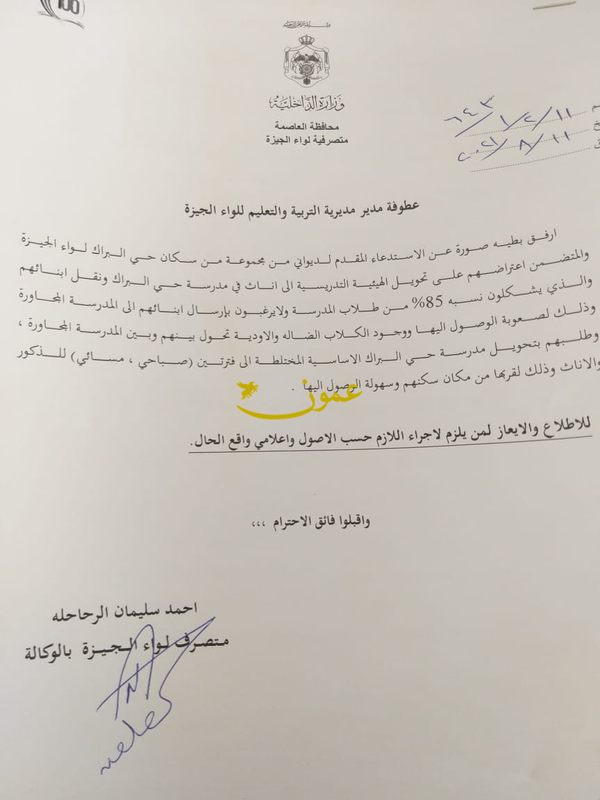 عمون - أحمد الدخيل - اعتصم أولياء أمور طلبة امام مبنى مديرية تربية الجيزة احتجاجا على قرار تأنيث مدرسة حي البراك.