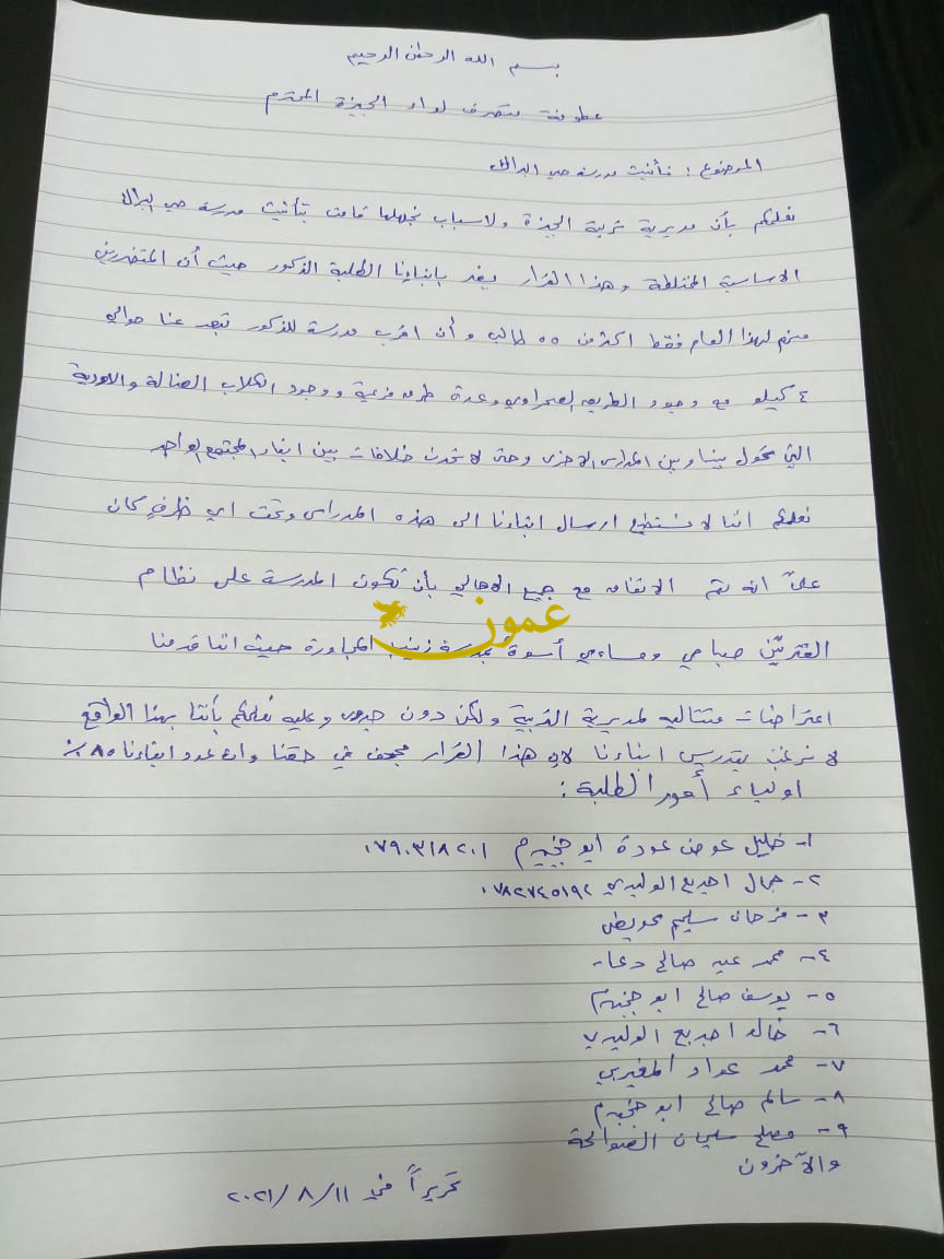 وبين ابو شخيدم أنه تضرر من القرار 35 طالباً، حيث تبعد اقرب مدرسة ذكور حوالي 4-5 كم ولا يتوفر بمنطقتها أي وسائل مواصلات.
