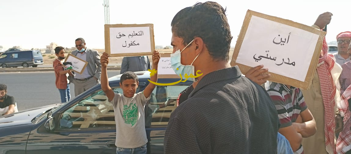 وحمل المعتصمون لافتات كتب عليها "اين مدرستي، التعليم حق مكفول".