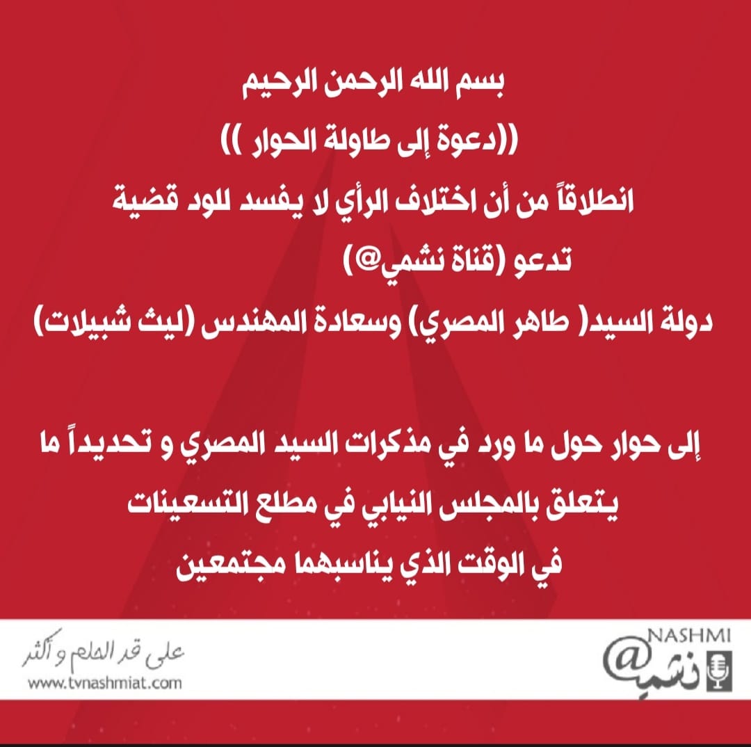 عمون - دعت قناة نشمي كل من رئيس الوزراء الاسبق طاهر المصري والسياسي الأردني المهندس ليث شبيلات إلى حوار حول مذكرات المصري والتي اشهرها مؤخرا تحت عنوان "الحقيقة بيضاء".