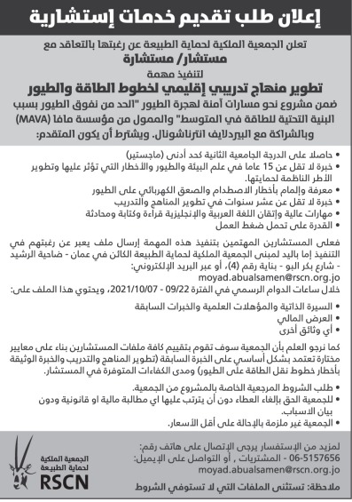 الجمعية الملكية لحماية الطبيعة ترغب بالتعاقد مع مستشار