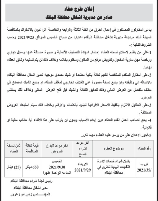 عطاء صادر عن مديرية اشغال البلقاء