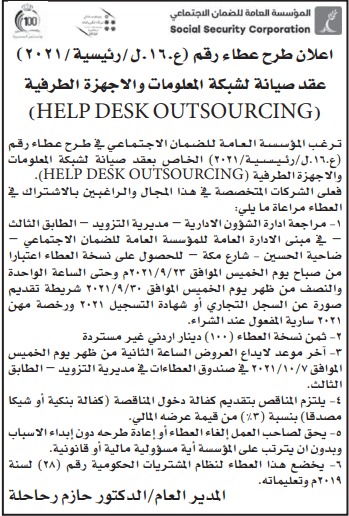 عطاء صادر عن الضمان الاجتماعي لصيانة شبكات المعلومات والاجهزة المصرفية