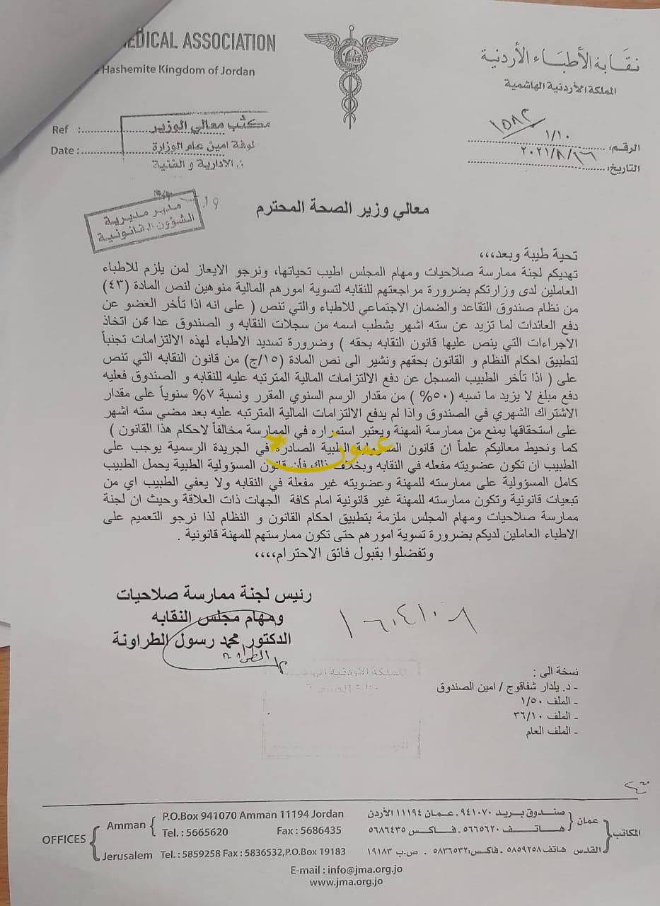 ومن جهته قال رئيس لجنة ممارسة صلاحيات ومهام نقابة الأطباء الأردنيين الدكتور محمد رسول الطراونة إن إنتساب الأطباء للنقابة هو مظلة حماية قانونية وإجتماعية لهم بالدرجة الأولى، ويشمل ذلك غايات تنظيم العمل وربط الزملاء والتواصل والتنسيق مع الجهة التي يعملون لديها سواء بالقطاع الخاص أو العام، وعليه وتبعا للمادة "43" من نظام صندوق التقاعد والضمان الاجتماعي والتي تنص على "في حال تأخر العضو عن دفع العائدات لما يزيد على 6 شهور، يشطب إسمه من سجلات النقابة والصندوق، إضافة للإجراءات التي ينص عليها قانون النقابة بحقه".