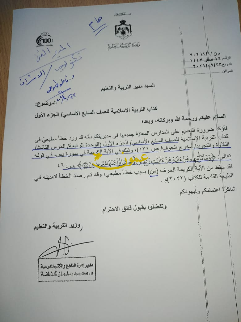 التربية تؤكد ورود خطأ مطبعي في كتاب التربية الاسلامية للصف السابع23-09-2021 10:41 PM