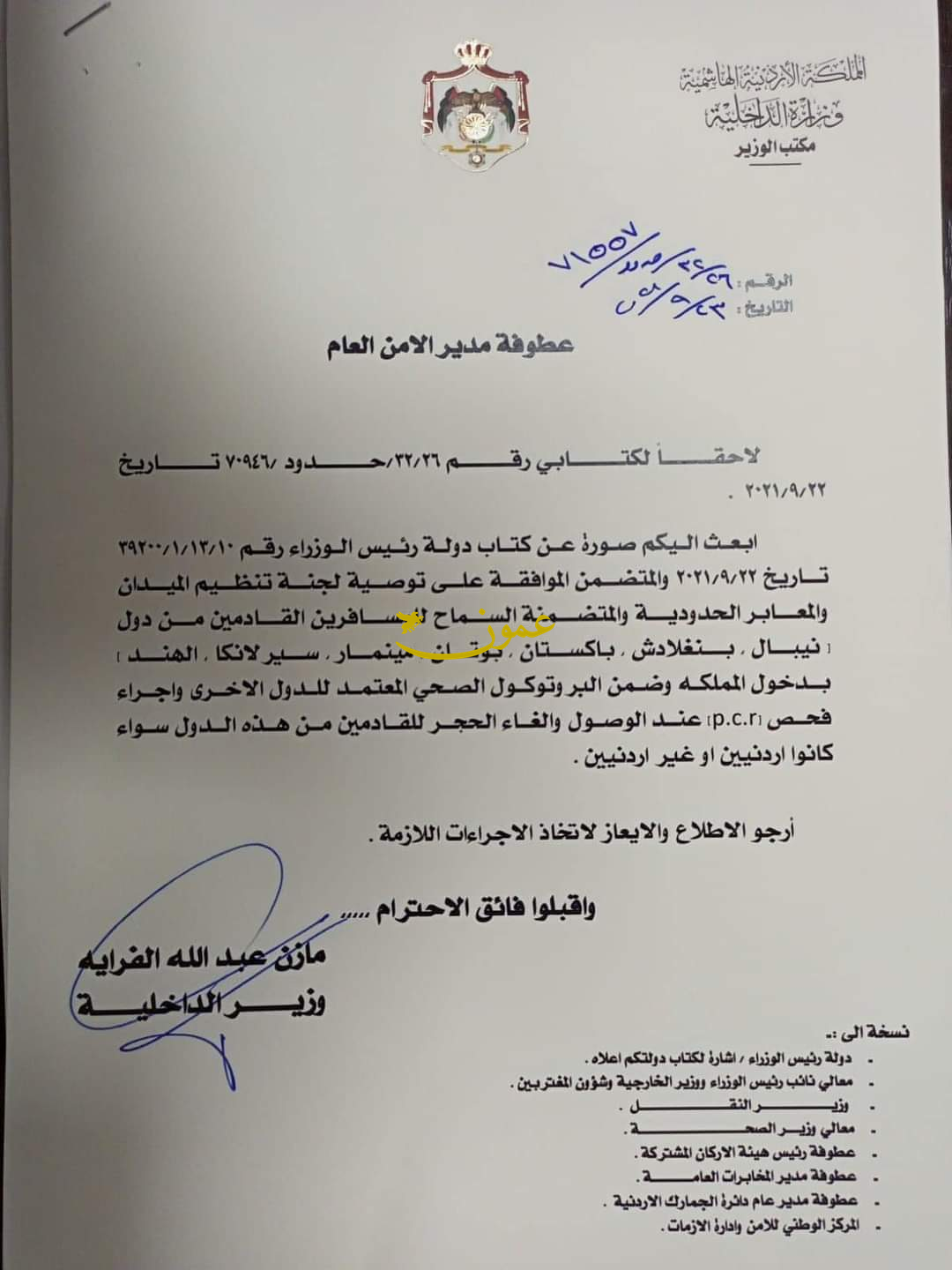 عمون - ينال المعاني - وافق وزير الداخلية مازن الفراية على توصية لجنة تنظيم الميدان والمعابر الحدودية والمتضمنة السماح للمسافرين القادمين من دول نيبال وبنغلادش وباكستان وبوتان ومينمار وسيرلانكا والهند بدخول المملكة وضمن البروتوكول الصحي المعتمد للدول الاخرى. |