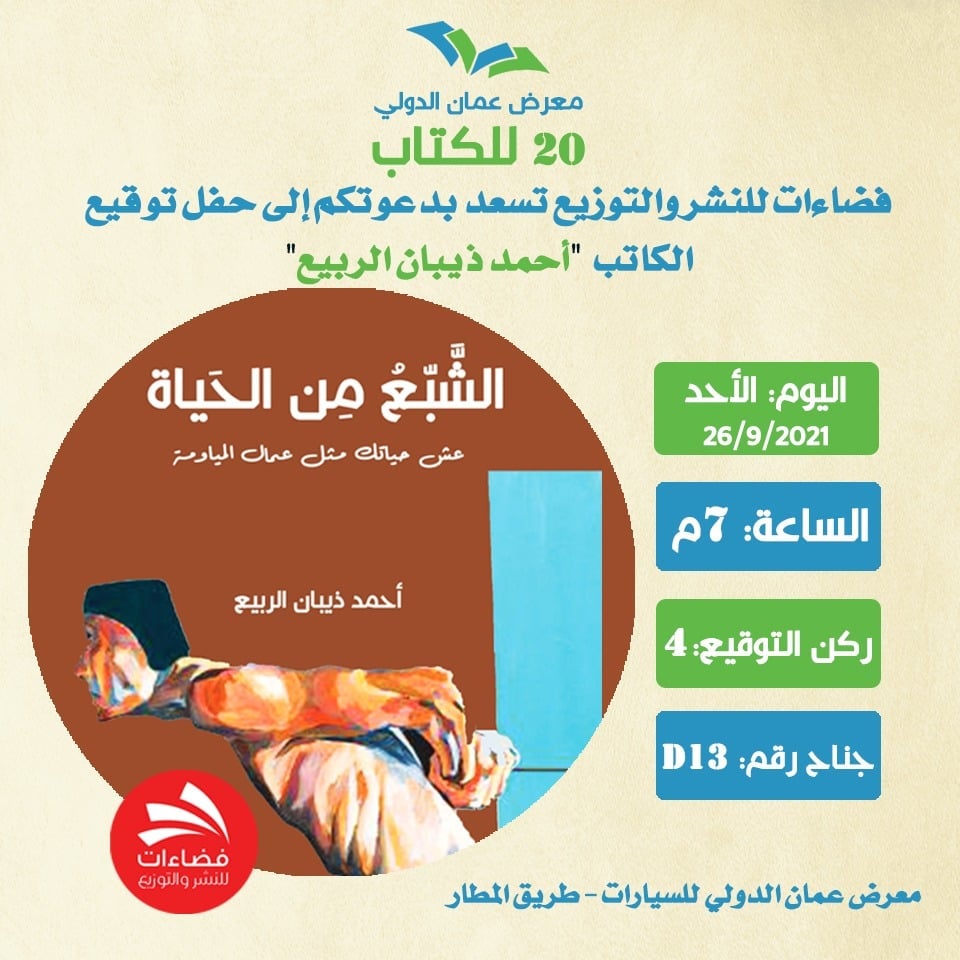 عمون - ضمن فعاليات معرض عمان الدولي للكتاب 2021، تقيم دار فضاءات للنشر والتوزيع حفل توقيع لكتاب "الشبع من الحياة " لمؤلفه الزميل الصحفي والكاتب أحمد ذيبان الربيع، عند الساعة السابعة من مساء الأحد الموافق 26 أيلول، وتقام فعاليات معرض الكتاب في قاعة عمان الدولي للسيارات -طريق المطار.