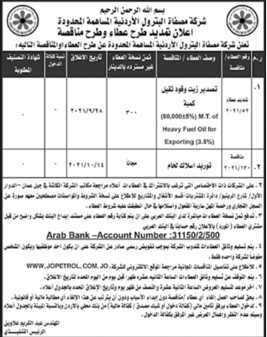 عطاء صادر عن شركة مصفات البترول الاردنية