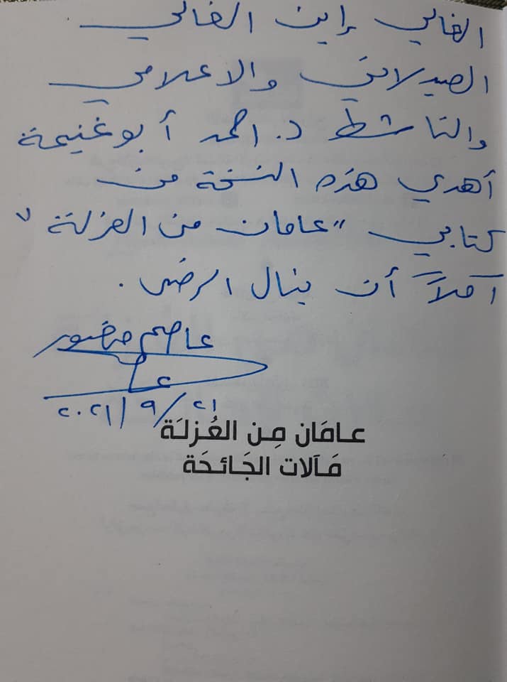 أكرمني الاخ والصديق د. عاصم منصور بهذا الإهداء الرقيق والمُفعم بروح المحبة والأخوة التي تجمعنا؛ مستذكرا بكل حُب وتقدير روح الوالد رحمه الله.