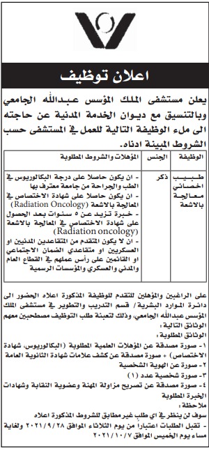 مطلوب طبيب اخصائي معالجة بالاشعة للعمل لدى مستشفى الملك المؤسس
