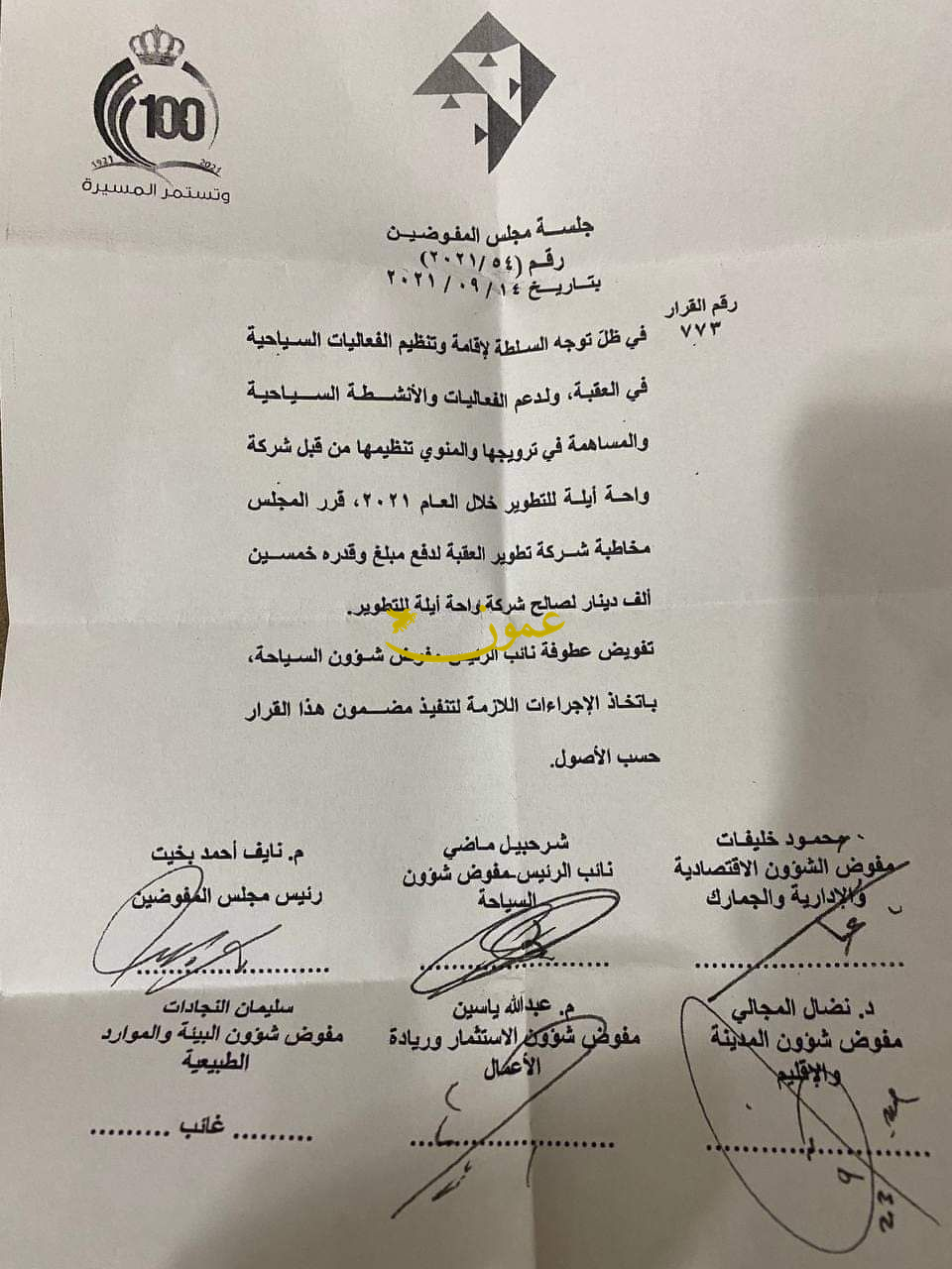 عمون - قرر مجلس مفوضي سلطة العقبة الاقتصادية الخاصة مخاطبة شركة تطوير العقبة لدفع مبلغ 50 ألف دينار لصالح شركة واحة أيلة للتطوير لدعم الفعاليات والأنشطة السياحية والمساهمة في ترويجها والمنوي تنظيمها من قبل "واحة أيلة".