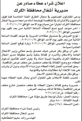عطاء صادر عن مديرية اشغال الكرك لتوسعة طريق مؤتة - عي