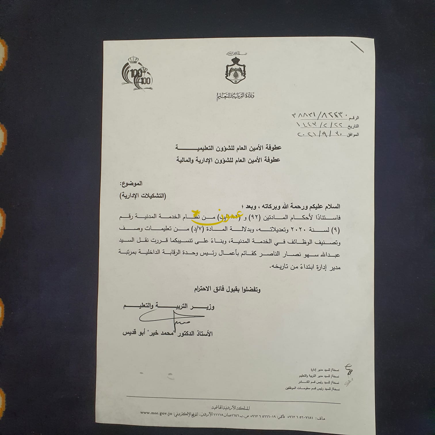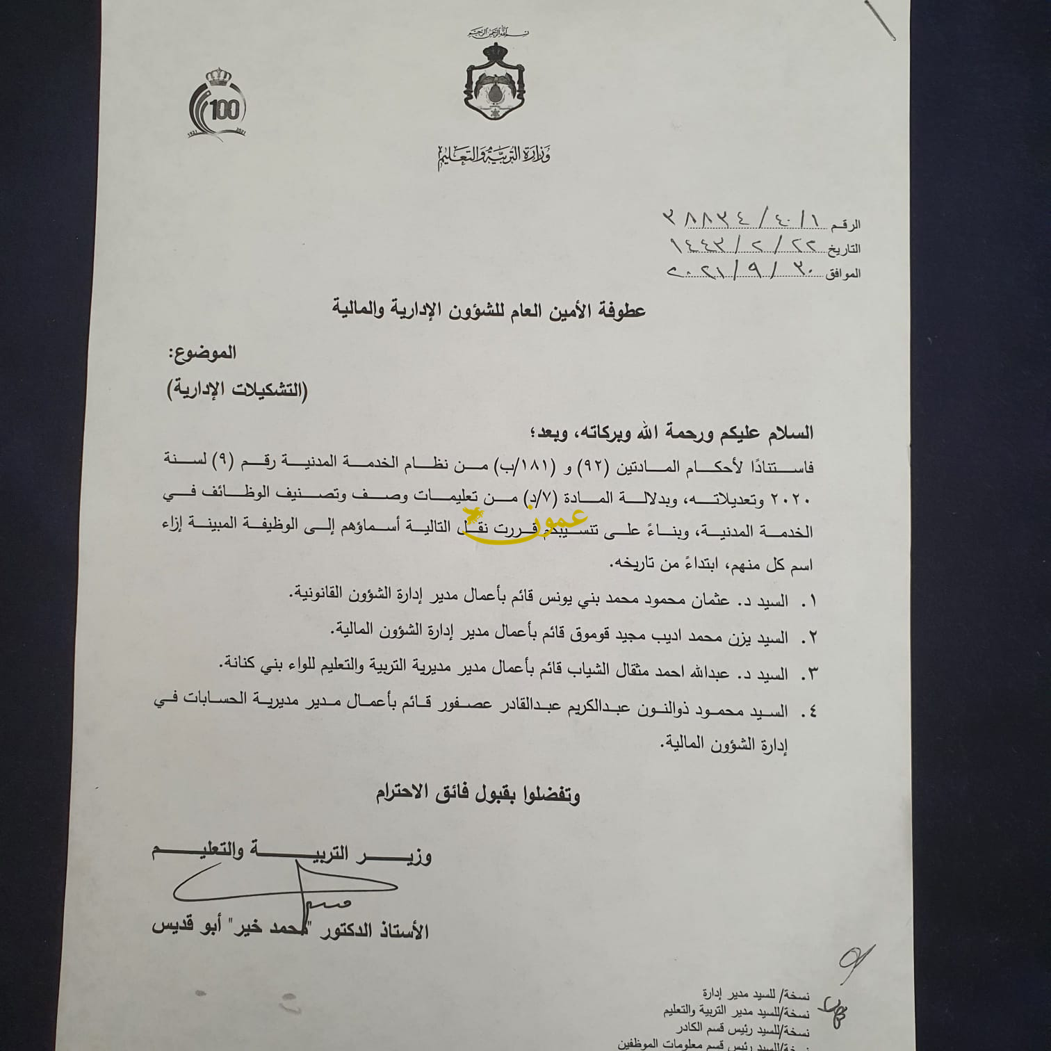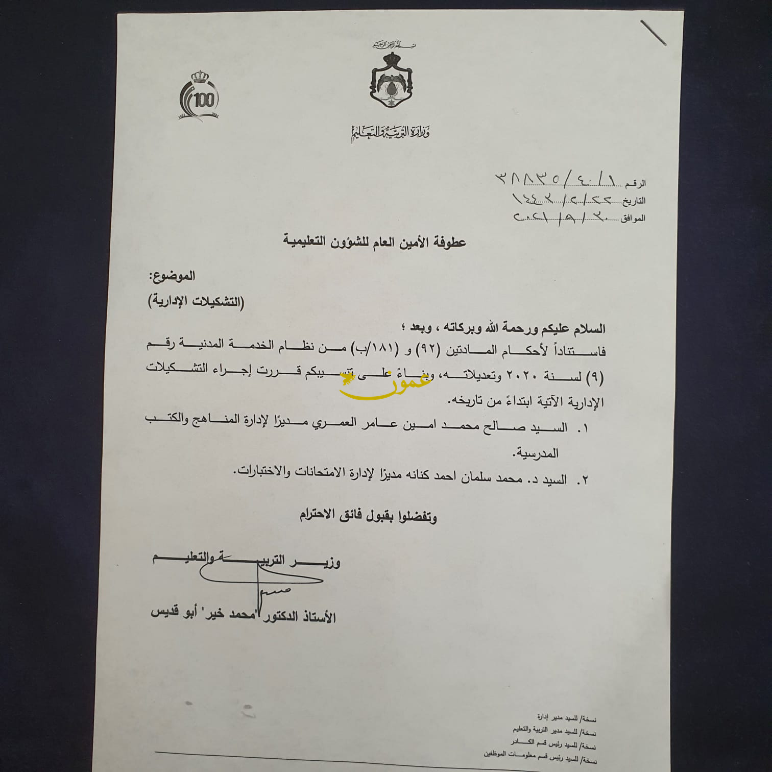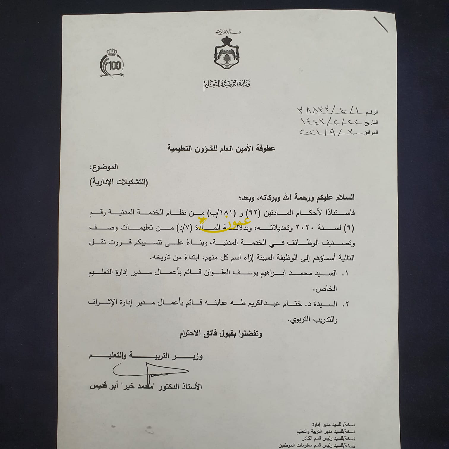 عمون - أحمد الدخيل - أجرى وزير التربية والتعليم الدكتور محمد خير ابو قديس تشكيلات ادارية واسعة شملت عددا من كبار موظفي التربية.
