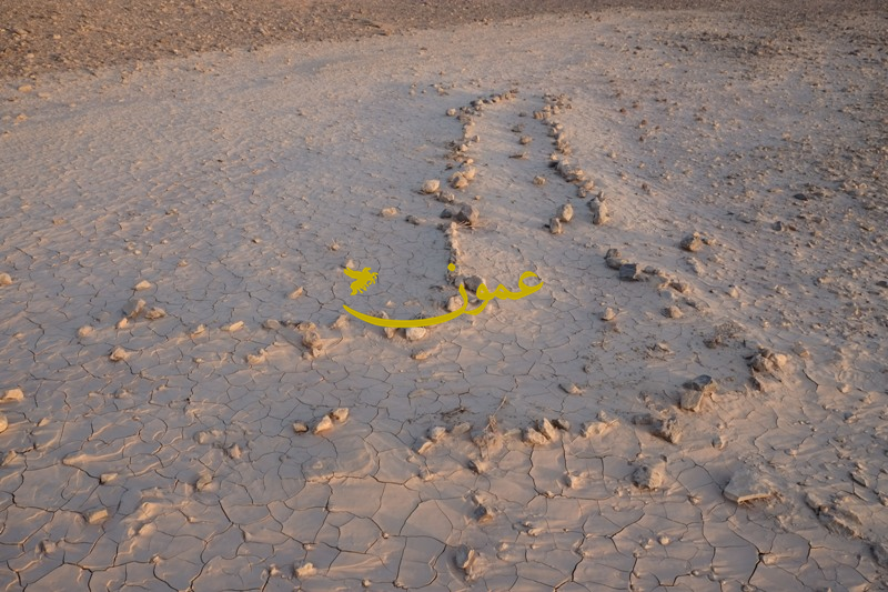 وهي حروف كُتبت على الأرض بكشط الطبقة الصوانية بخط عرضه نصف متر وعمق عشرة سانتيمترات، وبمعدل عشرة أمتار لكل حرف، أي أنه احتاج لوقت طويل لفعل ذلك! وليس كما أشيع أنه صُف من الحجارة البيضاء، والهدف منها أن يتم مشاهدتها من الطائرة، في حال أن حالف كاتبوه الحظ، ومن مجرى الخط يبدو أنها كتبت منذ ثلاث سنوات لوجود ثلاث طبقات رسوبية تراكمت في خط الكتابة، وبعد تفحص المكان وجدنا فيه بقايا موقد نار و معلبات، الأمر الذي يثير الاستغراب والحيرة في مكان عرف بقساوته أو الوصول إليه، ومن إشارات الاستغاثة الجوية المتعارف عليها رسم مثلث أو إشعال ثلاث نقاط نار بشكل مثلث.