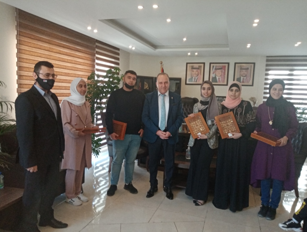 عمون - كرم مدير عام دائرة الشؤون الفلسطينية المهندس رفيق خرفان عددا من أوائل طلبة الثانوية العامة في المخيمات اليوم الخميس في مبنى الدائرة بحضور مدير مديرية خدمات المخيمات أسامة علقم. |