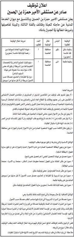 اعلان توظيف صادر عن مستشفى الامير حمزة