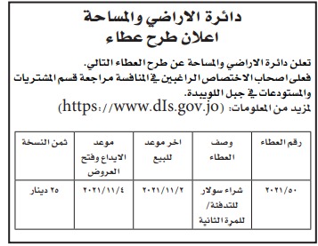 دائرة الاراضي والمساحة تطرح عطاء لشراء سولار للتدفئة