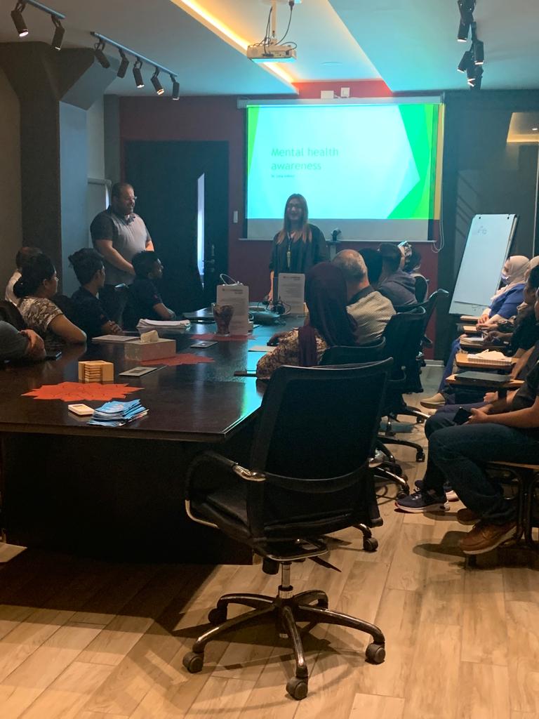 وقد تضمن التدريب تقديم تعريف بالصحة النفسية ومظاهرها في بيئة العمل بالإضافة لتأثير الضغوطات على الصحة النفسية للموظفين.