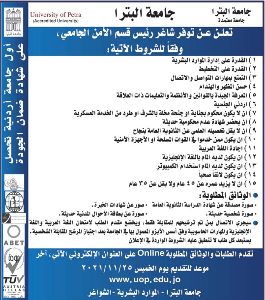 جامعة البترا تعلن عن توفر شاغر رئيس قسم الامن الجامعي