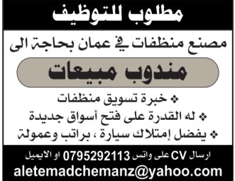 مصنع منظفات في عمان يرغب بتعيين مندوب مبيعات